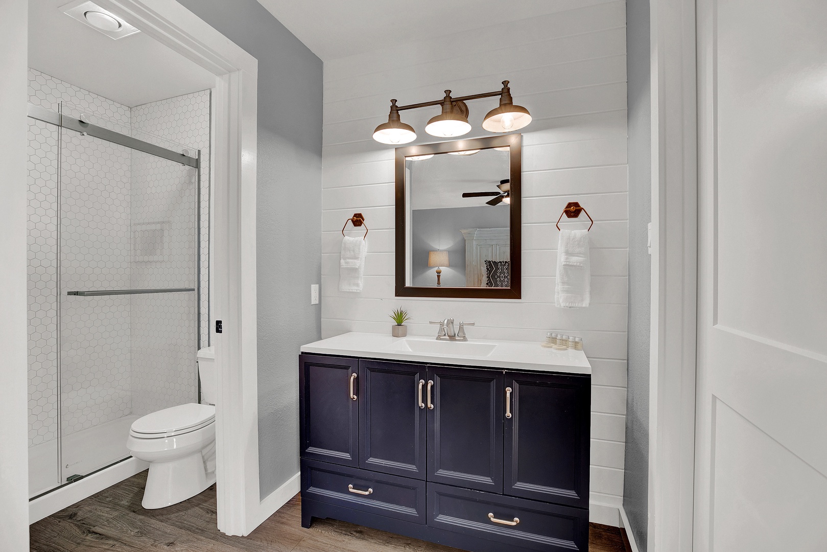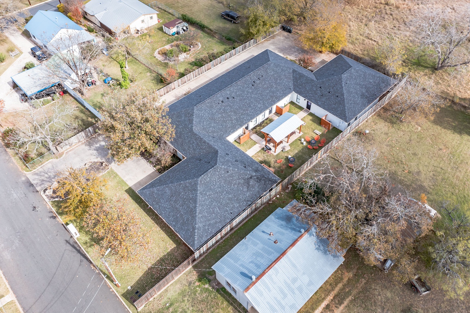 This stunning guest suite has two spacious bedrooms with king beds and two bathrooms, one of them being an ensuite private master bathroom. This beautiful guest suite comes with a big full kitchen, new appliances, an indoor dining space, and a living area. The suite is the best place for you and your loved ones to enjoy a family game night, enjoy the collection of travel books or just a casual wine night to dream about your next adventure! At this home, you will enjoy an evening of relaxation in your own private hot tub or unwind and relax after a long day of exploring Fredericksburg with a glass of wine by one of the fantastic firepits in the courtyard. The Wanderlust has available for you excellent amenities located in the outdoor shared space, which has a charcoal grill, picnic tables, covered pavilion, and multiple fire pits.