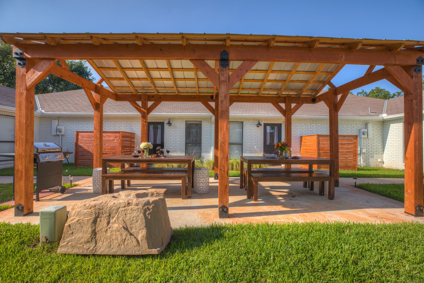 • Please note that the four-plex house is divided into four suites and the shared courtyard area is between them. Outdoor amenities such as a grill, tables, and fire pits are shared by other guests.