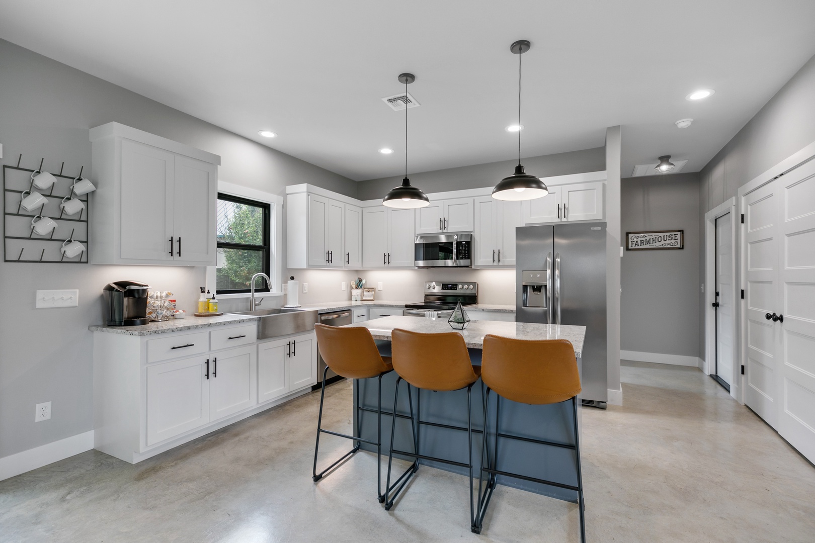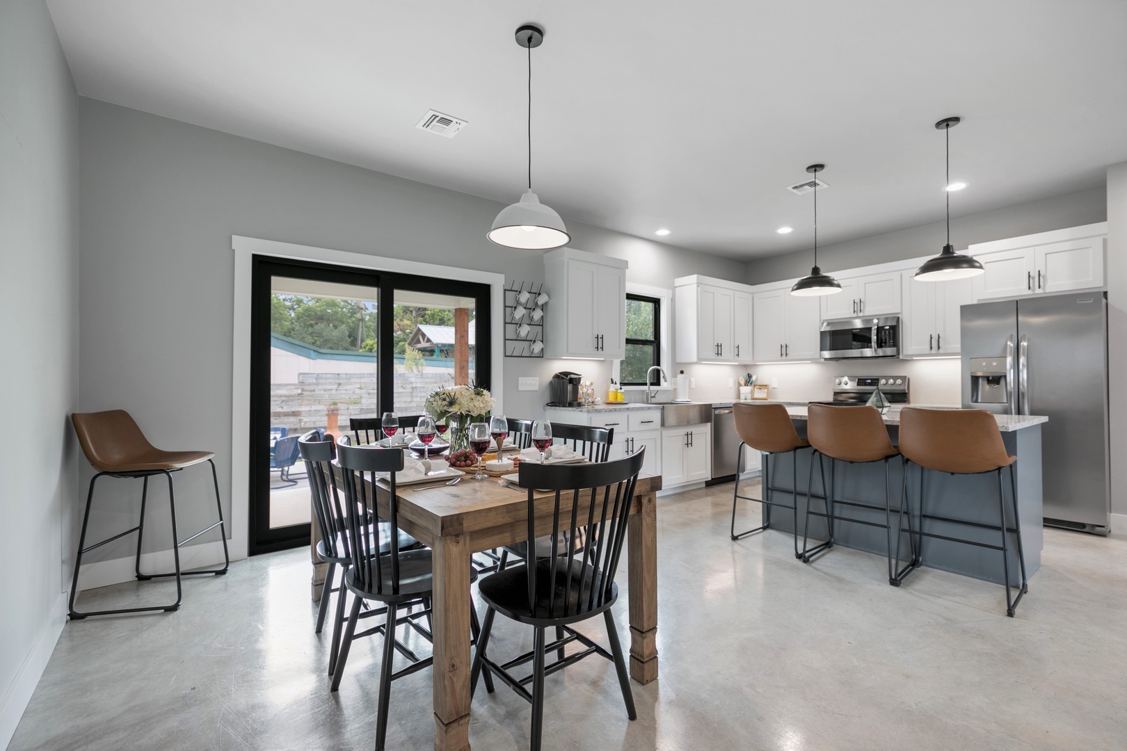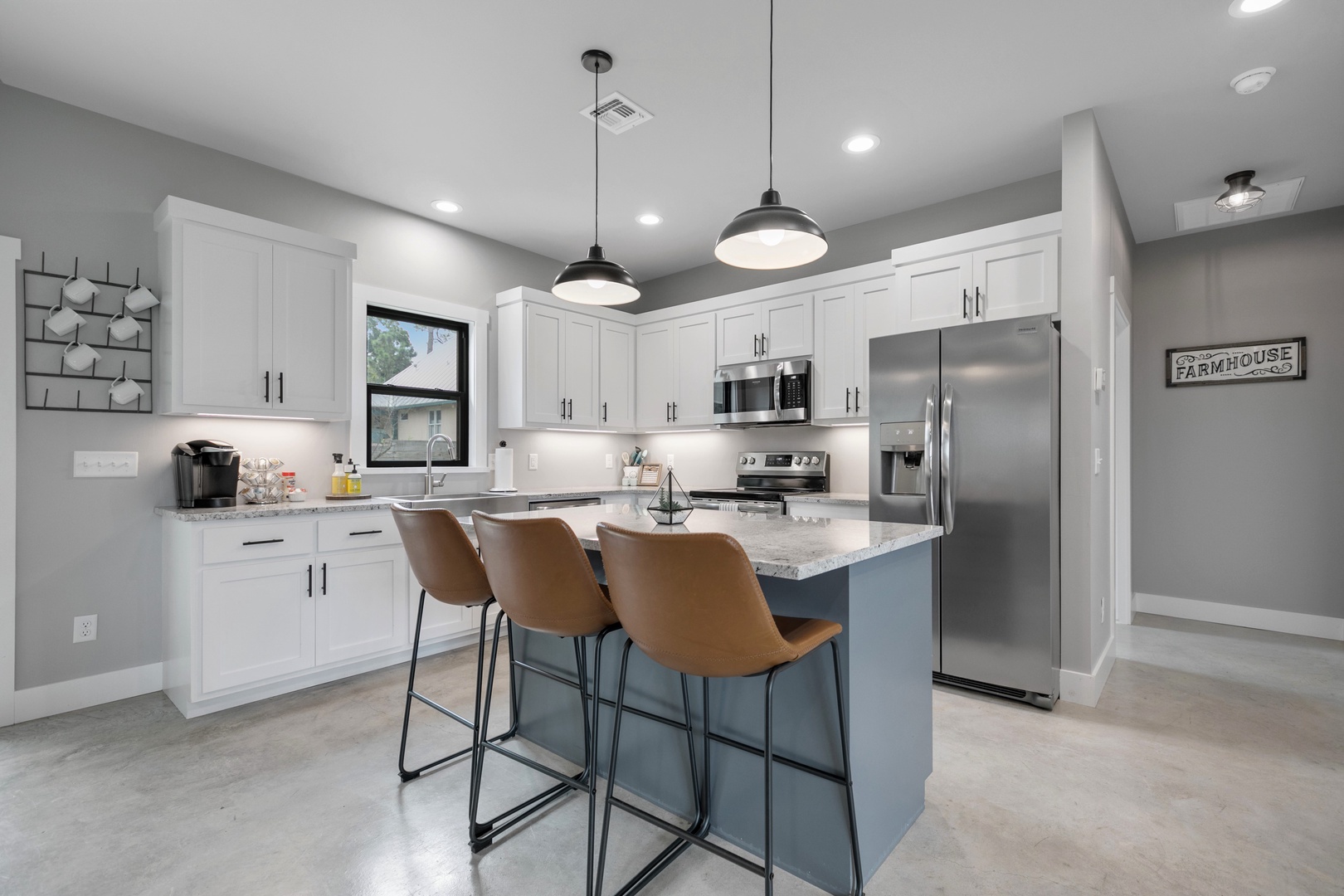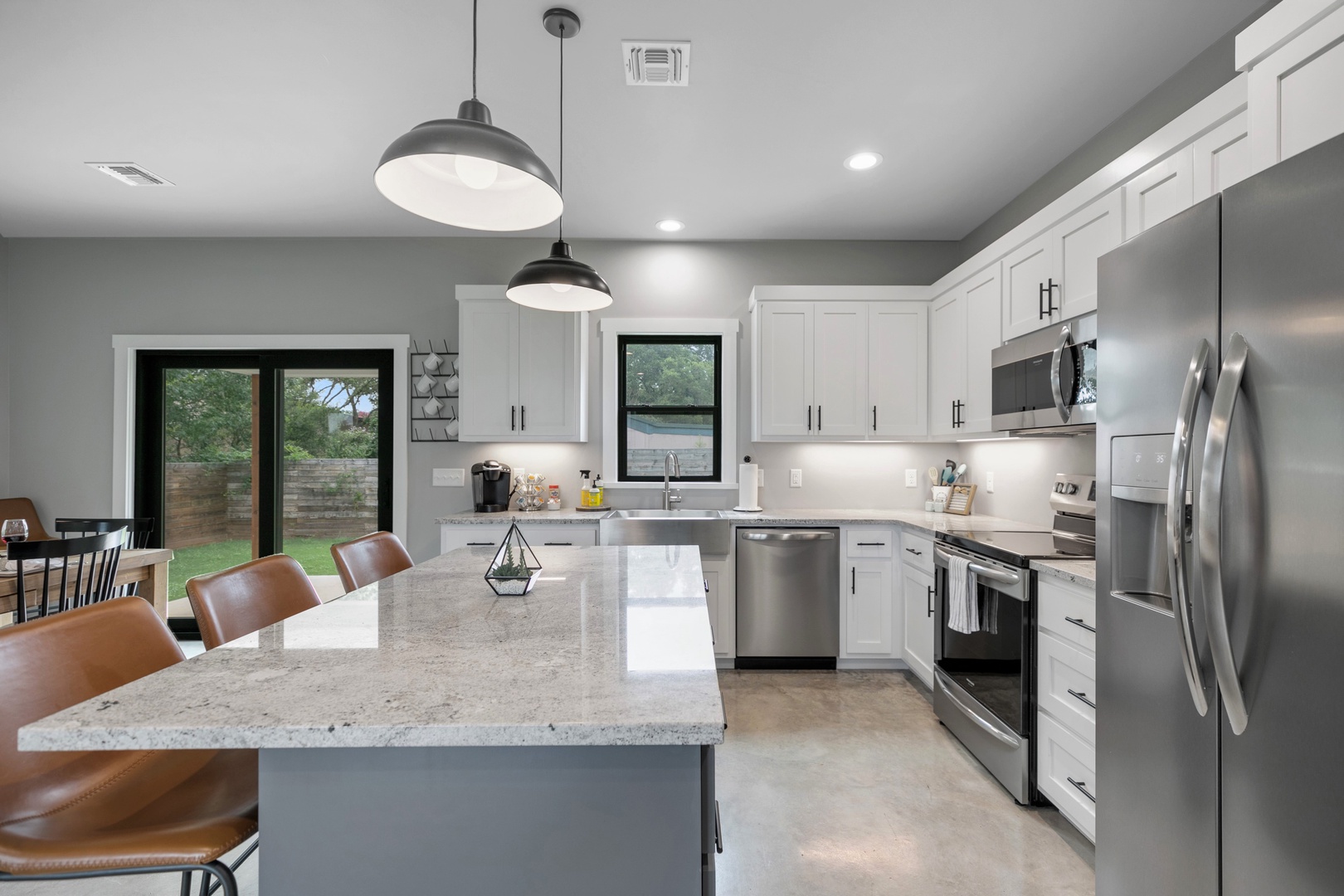 Welcome to the Wanderlust Haus! This Stunning and Modern Home is a three-bedroom, two-bathroom brand new home that is just 3 blocks from Main St. The Wanderlust kitchen, dining, and living room are open-concept and the fully functional kitchen displays beautiful white granite countertops and stainless-steel appliances. It is the perfect gathering space! The master bathroom includes a large walk-in tile shower while the guest bathroom includes a tub/shower combination. The fully functional kitchen displays beautiful white granite countertops and brand-new appliances including a Keurig coffee maker with complimentary coffee and creamer pods. The kitchen, dining, and living area are an open concept that allows for the perfect gathering space. This beautiful home has a gorgeous and large back porch and patio. You'll love sitting on the blue chairs on the back patio under the Texas stars!