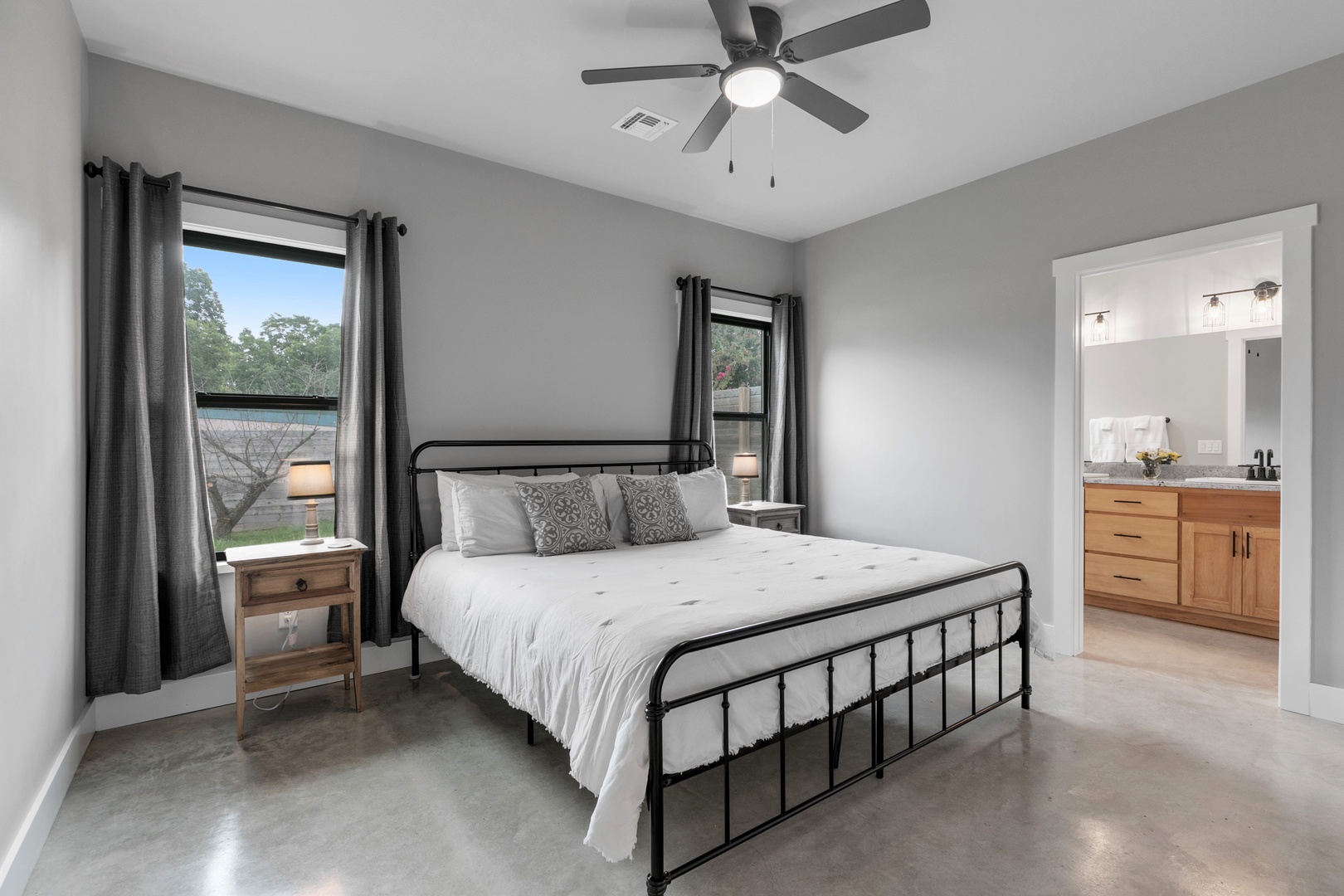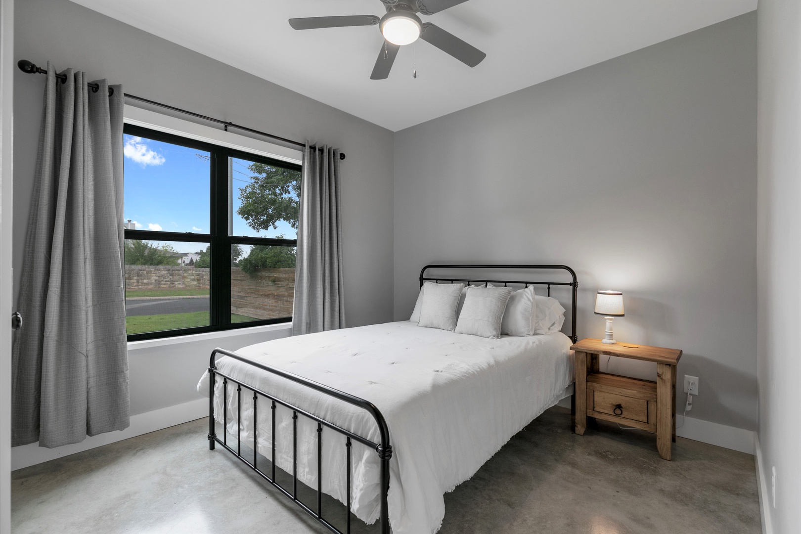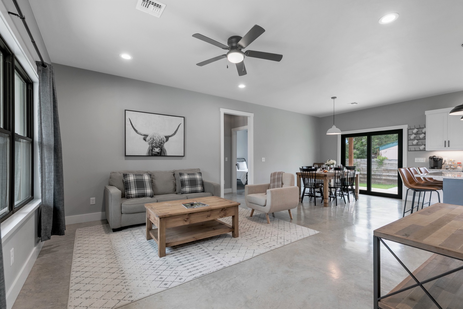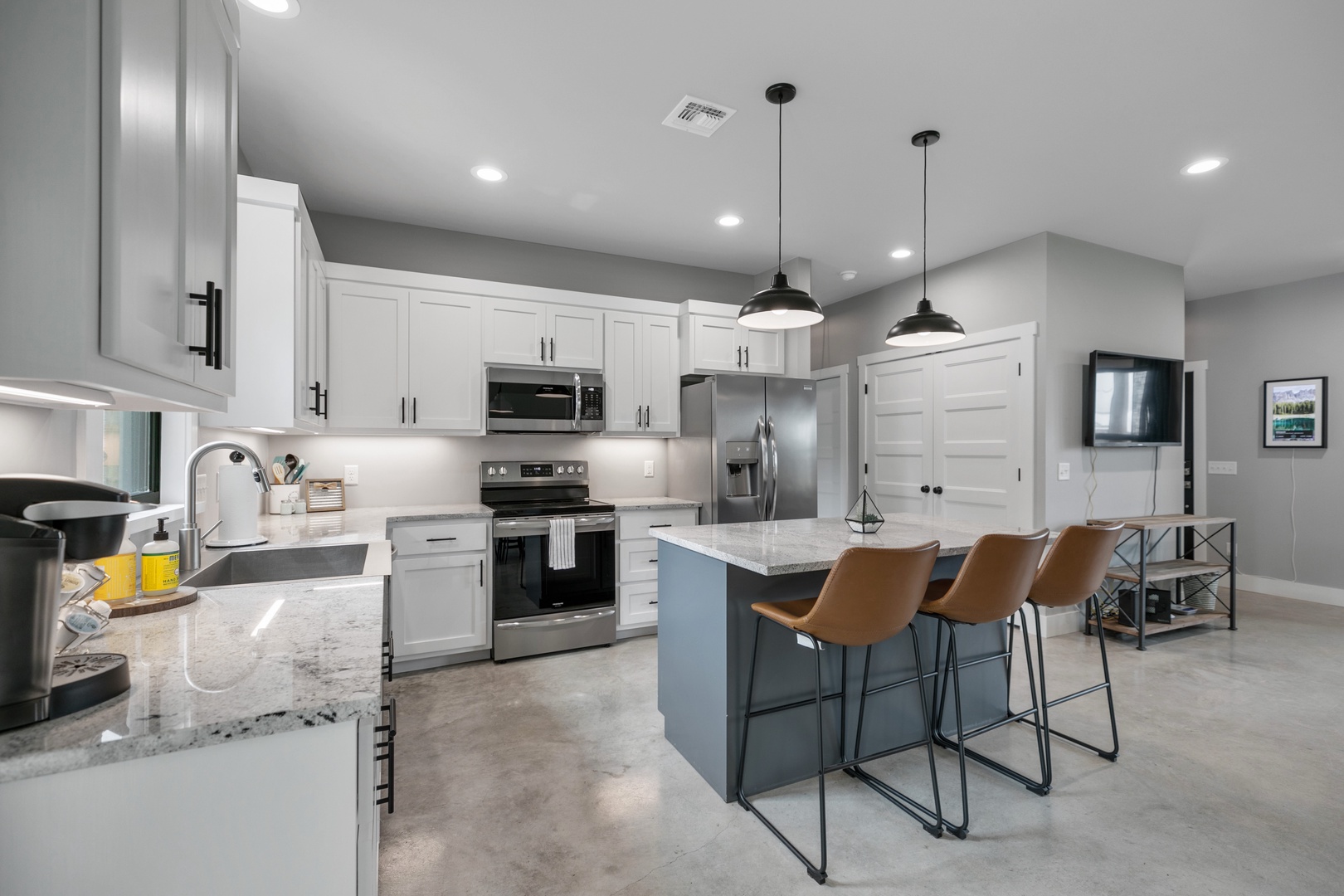 Welcome to the Wanderlust Haus! This Stunning and Modern Home is a three-bedroom, two-bathroom brand new home that is just 3 blocks from Main St. The Wanderlust kitchen, dining, and living room are open-concept and the fully functional kitchen displays beautiful white granite countertops and stainless-steel appliances. It is the perfect gathering space! The master bathroom includes a large walk-in tile shower while the guest bathroom includes a tub/shower combination. The fully functional kitchen displays beautiful white granite countertops and brand-new appliances including a Keurig coffee maker with complimentary coffee and creamer pods. The kitchen, dining, and living area are an open concept that allows for the perfect gathering space. This beautiful home has a gorgeous and large back porch and patio. You'll love sitting on the blue chairs on the back patio under the Texas stars!